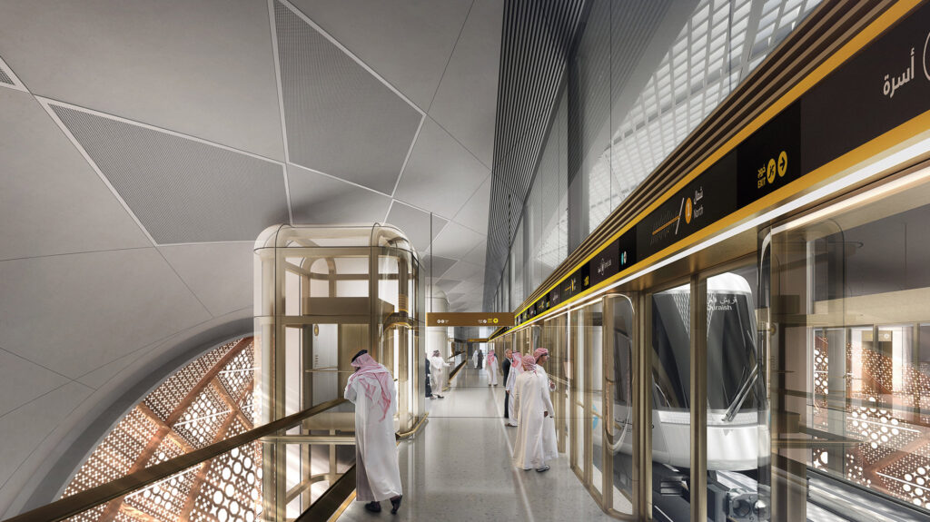 The distinctive white concrete arches tie the entire network together visually, while providing a flexible, modular unit for development and expansion. Each station also has shading screens contained within these arches, designed in collaboration with Saudi artists Ahmed Angawi and Dana Awartani, which express the local character – both materially and aesthetically.